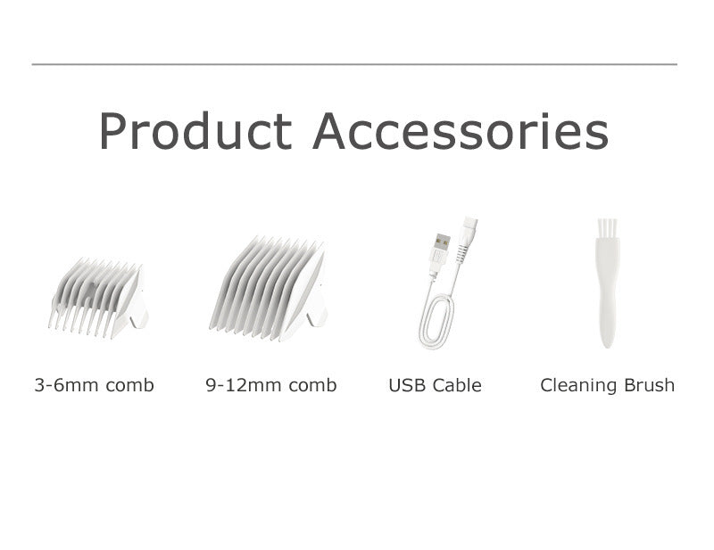 Standard accessories: hair clipper host * 1, USB charging cable * 1, brush * 1, 3-6mm positioning comb * 1, 9-12mm positioning comb * 1, product manual * 1